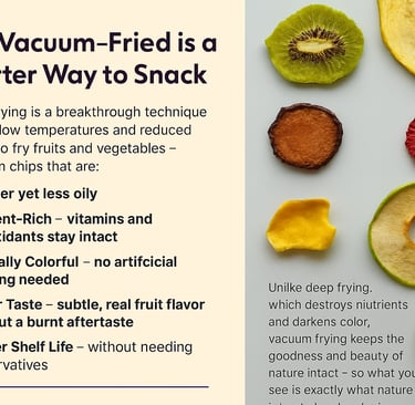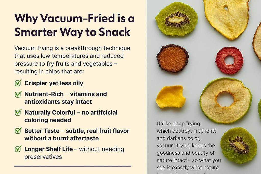 Vacuum frying is a revolutionary method that gently cooks fruits and vegetables at lower temperatures, preserving their natural color, nutrients, and flavor. Unlike traditional frying, it uses less oil and retains essential vitamins and antioxidants. The result? Chips that are lighter, crispier, naturally vibrant, and free from preservatives β offering a smarter, tastier way to snack without compromise.